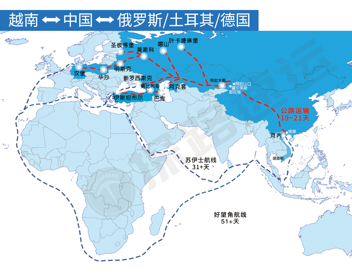 服务范围:整柜、零担均可,从河内出发,直达中亚、俄罗斯、土耳其及欧洲,助力货物高效送达欧亚主要消费与工业市场。